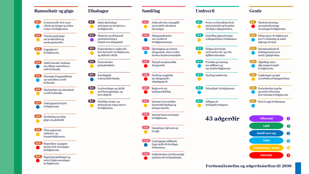 Nánara yfirlit yfir þessar 43 aðgerðir í aðgerðaáætlun, og stöðu þeirra, er að finna á heimasíðu Ferðamálastofu og á síðunni www.ferdamalastefna.is.